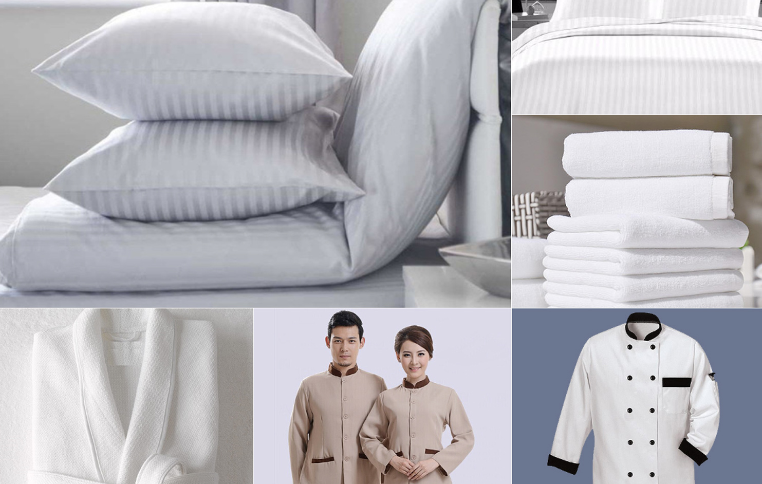 Discover our broad section of bed linen made from the finest quality cotton percale; with thread count transform your beds into luxury with our quality beddings. Smooth duvet covers, tight fitting sheets, plush inner duvets, pillow covers come together as essential bedding elements. Our collection of towel ranges from high quality face towels, hand towels, bath towels, pool towels and even bath mats, bathrobes and slippers. Outfit your housekeeping and hotel maid service in comfortable and sharp-looking uniforms that compliments your establishment.